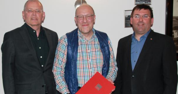 Josef Hoffmann (links) und der Landtagsabgeordnete Jörg Denninghoff (rechts) ehrten Achim Schuhmacher für 25 Jahre Mitgliedschaft in der SPD Burgschwalbach.