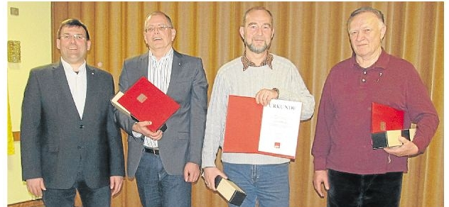 Burgschwalbach. In der Jahreshauptversammlung des SPD-Ortsvereins Burgschwalbach konnten treue Parteiangehörige für ihre langjährige Mitgliedschaft geehrt werden. Die Ehrung übernahm der Landtagsabgeordnete Jörg Denninghoff. Für 25 Jahre Mitgliedschaft wurde Josef Hoffmann ausgezeichnet, für 40 Jahre Otmar Look, Wolfgang Bondorf und Johann Schuh. Von links: Jörg Denninghoff, der Vorsitzende des SPD-Ortsvereins, Josef Hoffmann, Otmar Look und Wolfgang Bondorf. Der Vorsitzende Josef Hoffmann und Jörg Denninghoff dankten den Genossen für ihre Arbeit im Ortsverein.